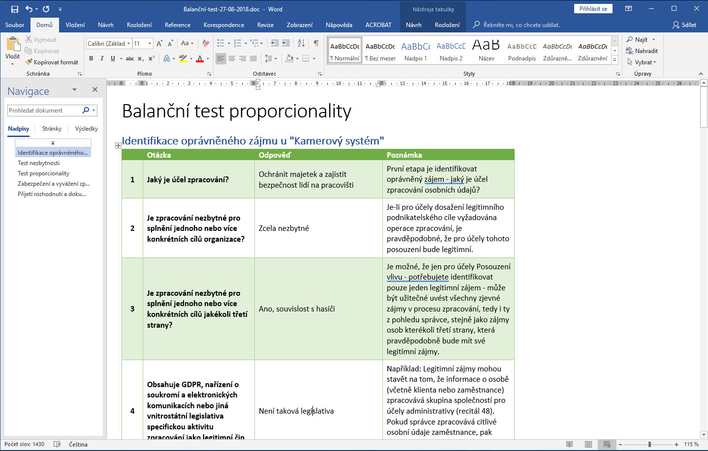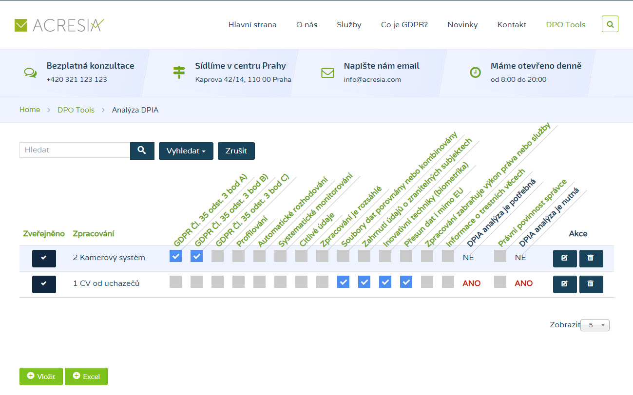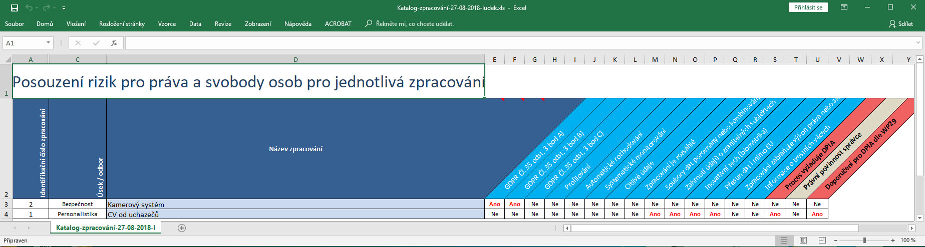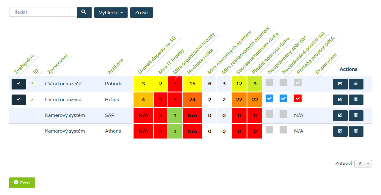 Výše ukázka výstupu jednoduché DPIA analýzy dle WP 29 ze systému i exportu do Excelu.