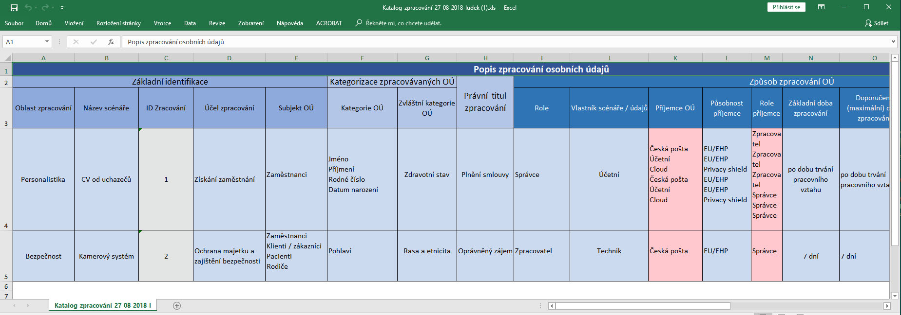 Výše je uvedena ukázka výstupu ze systému přímo do formátu Excelu. Správu katalogu zpracování umožňujeme bezplatně již ve verzi freemium, pouze na základě Vaší registrace.